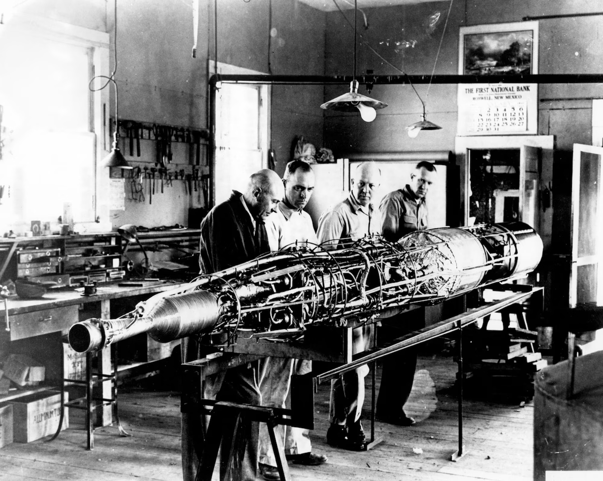 Robert Goddard en zijn team in 1940 aan het werk in Roswell - Foto: U.S. Air Force