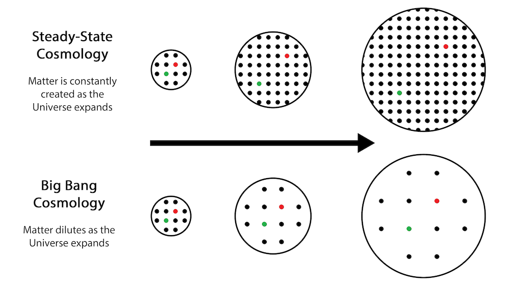 In 1948 presenteerden Fred Hoyle, Hermann Bondi en Thomas Gold hun steady-state theorie. Hun uitgangspunt was het “perfecte kosmologische principe”: niet alleen is het heelal op grote schaal homogeen (overal ongeveer hetzelfde) en isotroop (in alle richtingen gelijk), maar dit moet ook in de tijd gelden. Met andere woorden: op de grootste schaal is het heelal altijd hetzelfde geweest en zal het altijd hetzelfde blijven. Maar hoe valt dit te rijmen met het feit dat Hubble had aangetoond dat het heelal uitdijt? Hoyle en zijn collega’s kwamen met een ingenieuze oplossing. Terwijl de ruimte uitdijt, zou er voortdurend nieuwe materie ontstaan om de lege ruimte op te vullen. Hierdoor zou de gemiddelde dichtheid van het heelal gelijk blijven, ook al bewegen sterrenstelsels steeds verder uit elkaar.