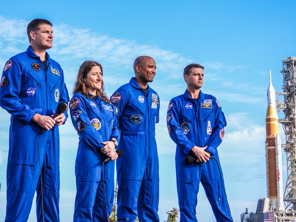 De Artemis II crew tijdens de roll-out van de Artemis II maanraket - Foto: Astrid Cordero
