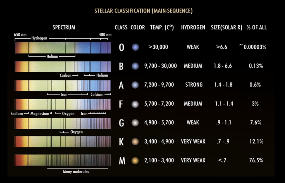 - M-sterren: Rood, koeler dan 3.700 °C. Dit zijn de bekende rode dwergen, de meest voorkomende sterren in het heelal.