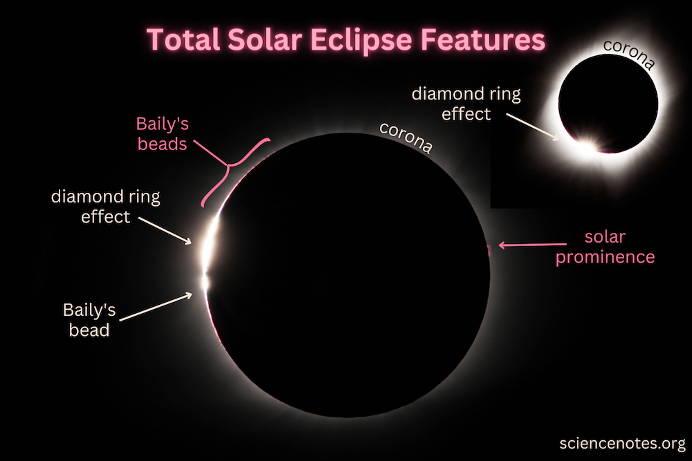 Vlak voor de totaliteit ontstaat een spectaculair fenomeen genaamd Baily's Beads of "parelsnoer". Doordat de maanrand geen gladde oppervlakte heeft maar bestaat uit diepe kraters en hoge bergen, verdwijnen sommige stukjes zonsrand als allerlaatste achter de diepste kraters, wat een parelsnoer van lichtvlekjes vormt. Dit effect werd voor het eerst beschreven door de Engelse astronoom Francis Baily in de 19e eeuw.